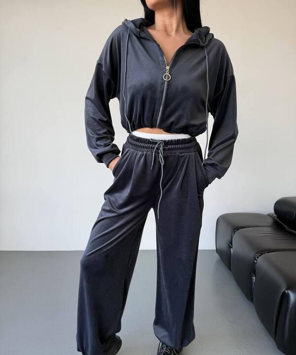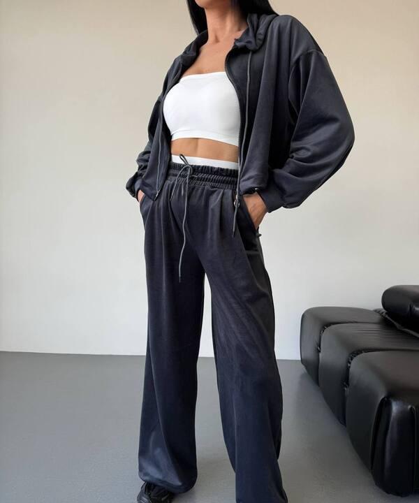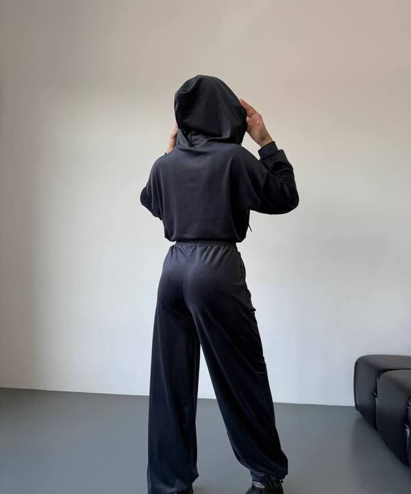 Спортивный костюм женский велюровый демисезонный двойка с худи на молнии и свободными брюками k-128663