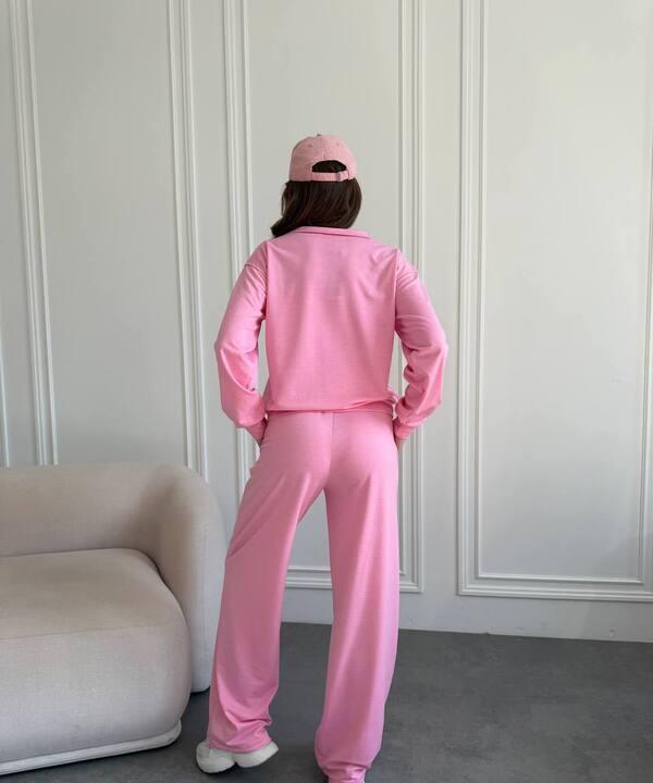 Брюки свободного кроя гармонично дополняют верх и создают расслабленный, но очень аккуратный силуэт. Такая посадка делает костюм удобным для ежедневной носки, прогулок, поездок и активного ритма жизни. Брюки красиво смотрятся в движении, не перегружают силуэт и делают весь комплект гармоничным и завершенным. Это именно тот вариант, который можно носить как полноценным готовым образом, так и сочетать его элементы отдельно с другими вещами гардероба.