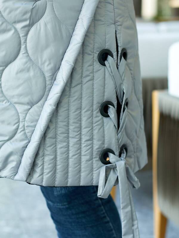 Жилетка оснащена глубоким капюшоном, который укроет от ветра и непогоды, а также удобной застёжкой-молнией на всю длину. Боковые завязки позволяют регулировать силуэт по фигуре — от свободного до более приталенного. Функциональные карманы делают модель практичной, а декоративная нашивка добавляет современный акцент.