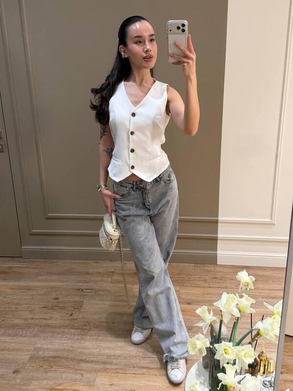 Костюмная ткань придает модели благородный характер и позволяет носить жилетку в самых разных сочетаниях. Она отлично комбинируется с брюками, джинсами, шортами, юбками, классическими костюмами и легкими летними комплектами. Жилетку можно надеть поверх рубашки, блузы, футболки, топа или носить как самостоятельный акцентный верх, создавая более смелый и модный образ. В любом варианте она добавляет наряду структуру, делает его более дорогим визуально и помогает выглядеть продуманно без лишних усилий.